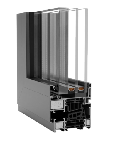 Die Tiefe der Fensterprofile beträgt 77 mm (Rahmen) bzw. 80,8 mm (Flügel). Die Rahmen auf der Außenseite sind schmal – so werden die Glasfläche und damit das einfallende Licht maximiert, die Konstruktion wirkt schlank und leicht. Es können Scheiben mit Dicken von 7–52 mm (Rahmen) bzw. 15–60 mm (Flügel) verwendet werden; dies ermöglicht die Montage aller auf dem Markt anzutreffenden Typen von Doppel- und Dreischeiben-Glas, Schallschutzglas oder einbruchhemmendem Glas.